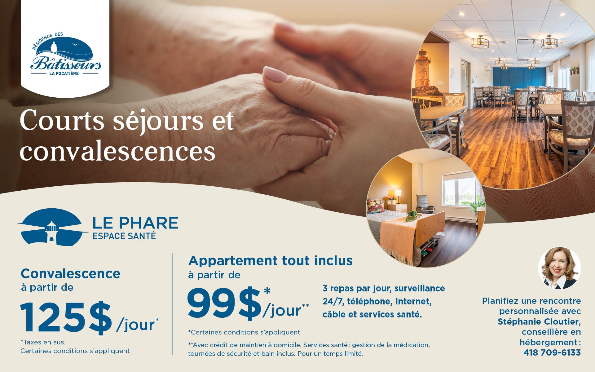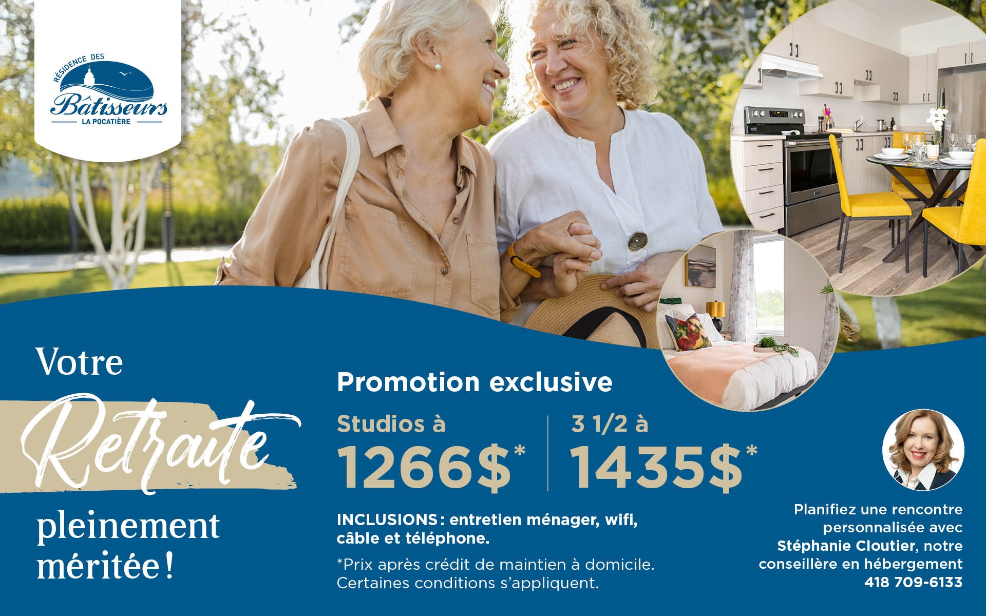 La Résidence des Bâtisseurs – La Pocatière offers a modern complex with a unique character, featuring 199 apartments and a wide range of services and amenities to help you enjoy your retirement with complete peace of mind. Whether you choose one of our studio apartments, one- or two-bedroom apartments with full kitchens, or our care studios, taking care of your health and safety is our top priority.